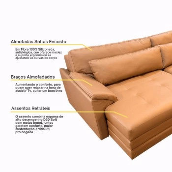 - Almofadas fixas Retráteis, com espuma de poliuretano D30, recobertas por manta de fibra de poliéster, garantindo conforto, resistência e melhor retorno da espuma.